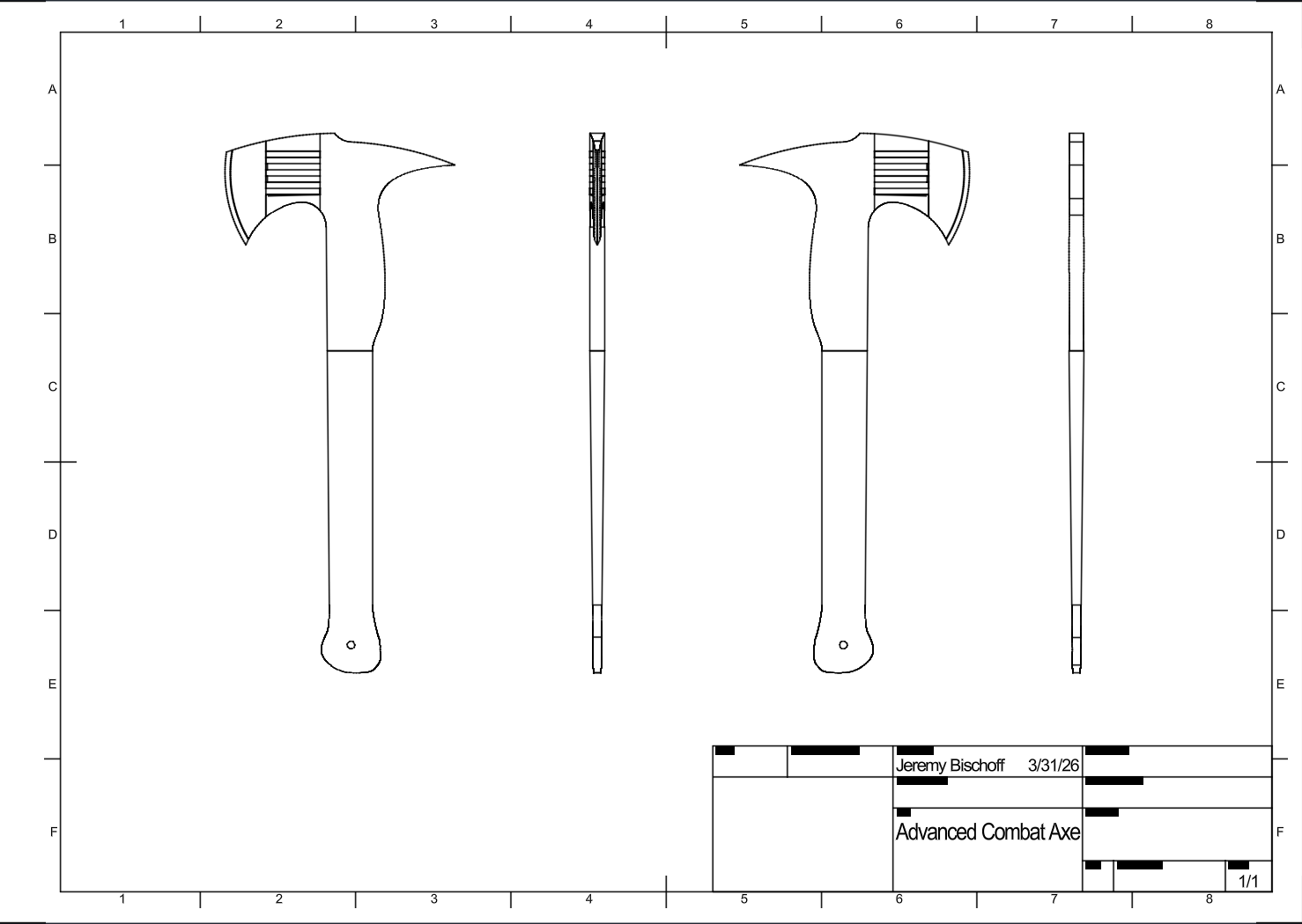Advanced Combat Axe -- a lightweight but incredibly strong combat axe executed in a Titanium lattice, with a user-replaceable steel edge, achieving a 50% weight savings. Also available in a camp axe form factor.